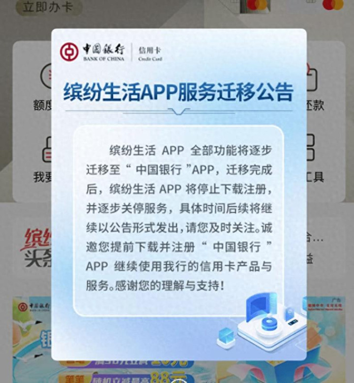 近日,某用户在登陆中国银行“缤纷生活”APP时,弹出功能迁移通知,提示该APP将停止下载注册,并逐步关停服务。